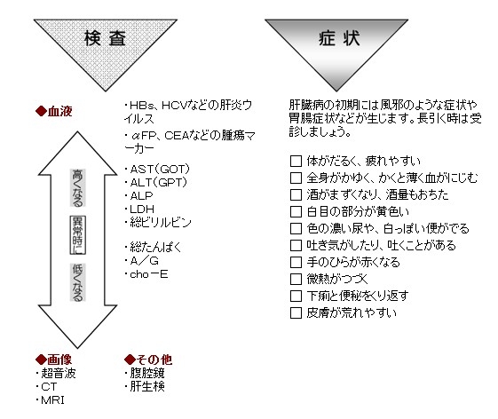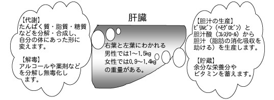 肝臓は、代謝・解毒・胆汁の生産など500 種以上の働きをこなす、人体のかなめともいえる臓器です。しかし、沈黙の臓器といわれるほど、自覚症状に乏しく、自分で変だと気づいたときには、かなり悪くなっていることもあります。早期発見・早期治療に努め、肝臓に優しい生活を送りましょう。